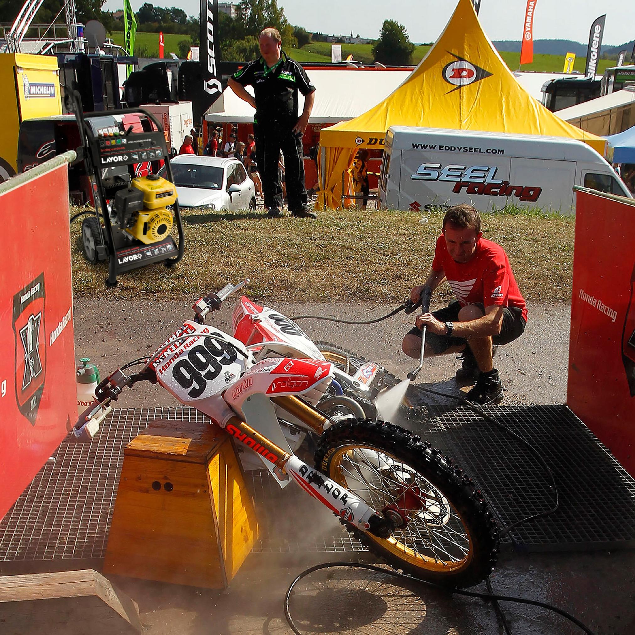 Idealna do mycia motocykli, łodzi, samochodów lub powierzchni zewnętrznych w miejscach, gdzie brak dostępu do prądu. Łatwo przenośna na każdym rodzaju powierzchni dzięki solidnej metalowej ramie i dużym tylnym kołom.