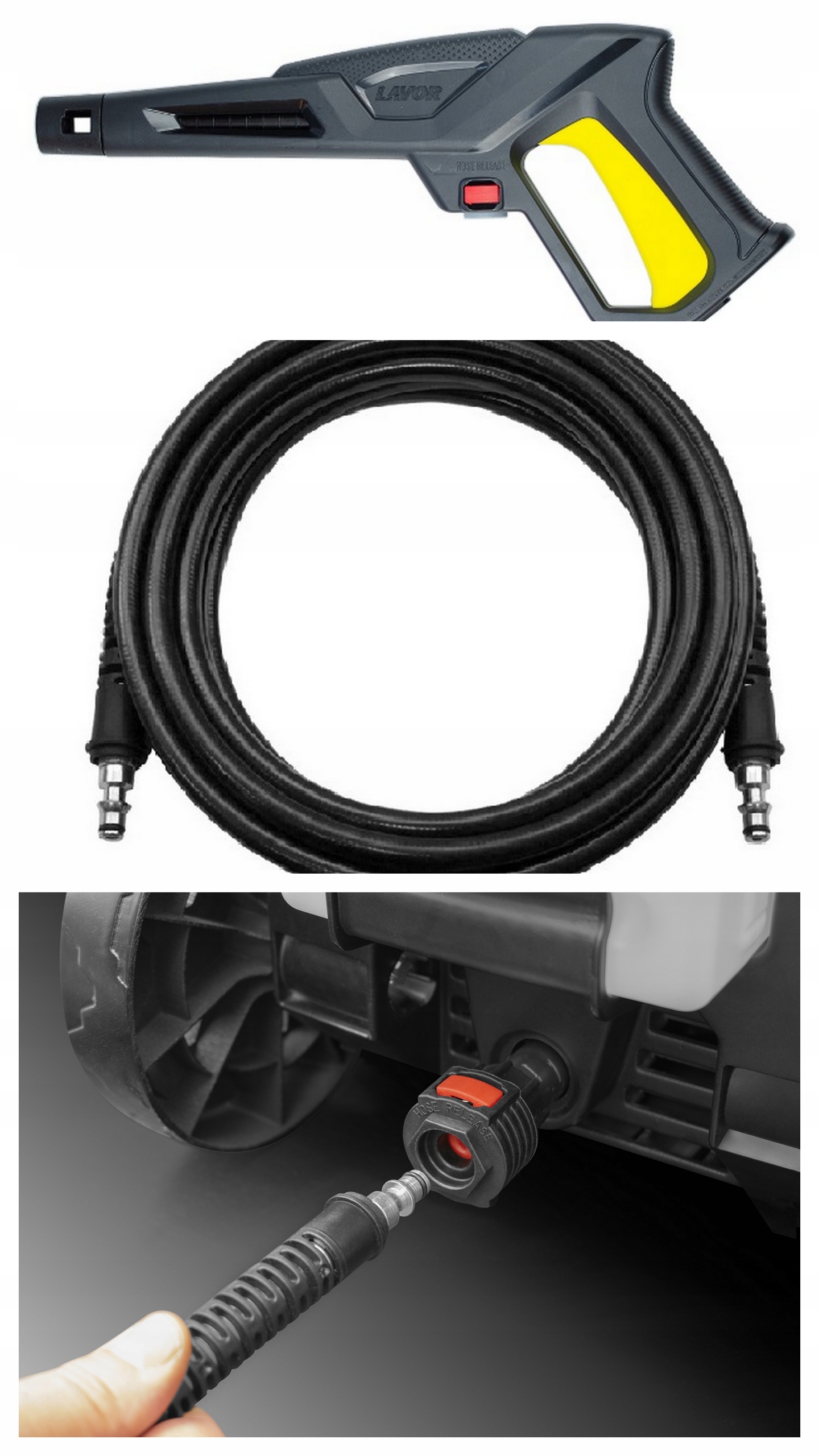 Myjka LVR4 180PLUS została wyposażona w bardzo użyteczny system FAST CLICK. Pompa na wyjściu posiada złącze CLICK i podobne złącze jest w pistolecie.Szybki i wygodny montaż węża wysokociśnieniowego bez specjalnych narzędzi hydraulicznych.