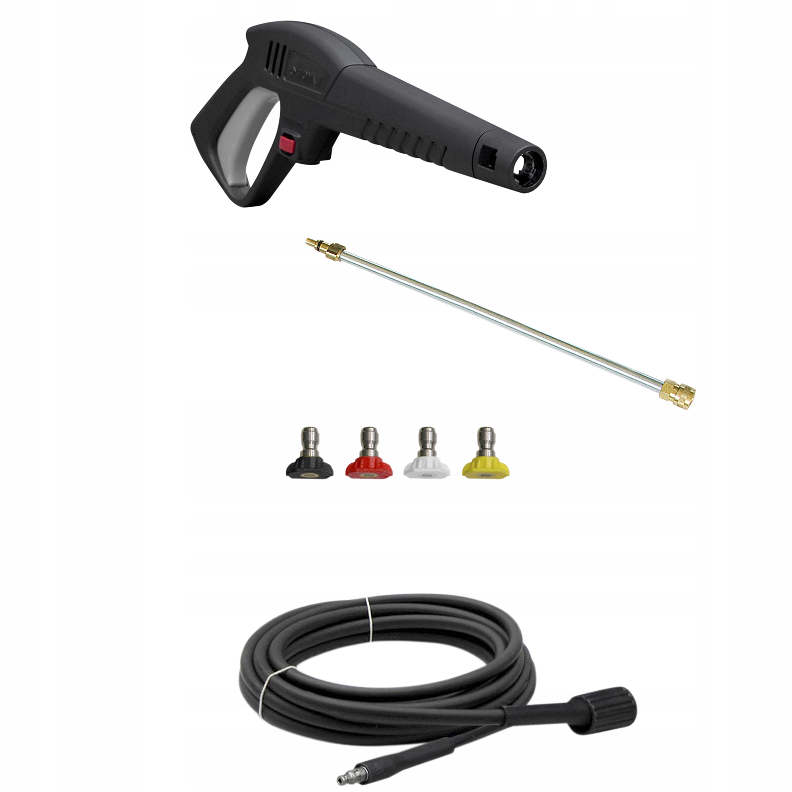 Myjka została wyposażona w profesjonalne akcesoria. Pistolet mosiężny – dla większego bezpieczeństwa pracy wszystkie połączenia są na mosiężne gwinty. Lanca chromowana z mosiężnymi złączkami. Wytrzymałe dysze.