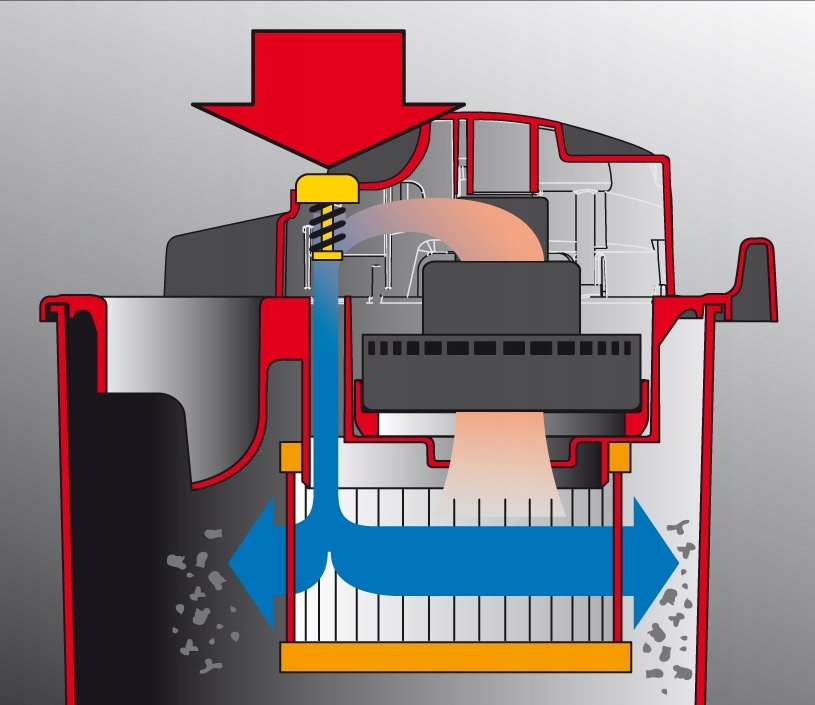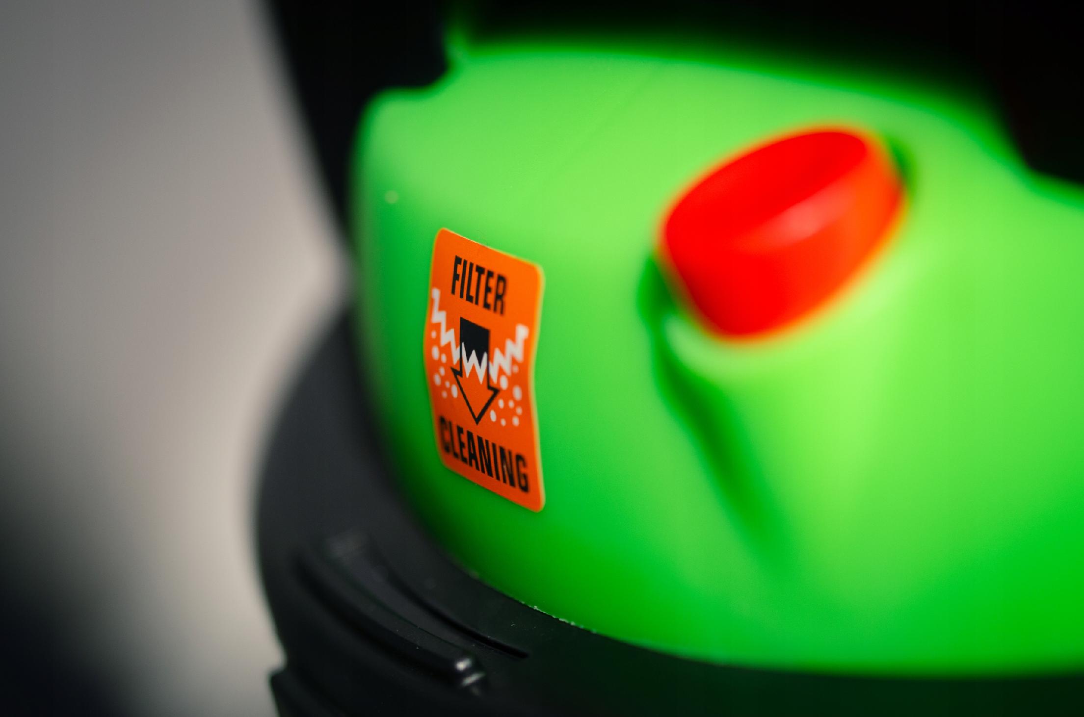 Profesjonalny system otrząsania pozwala na przedmuch filtra z pyłów które osadzają się podczas pracy na filtrze. Przyciskając czerwony przycisk otwiera się kanał przez który przepływa powietrze do filtra. WYDŁUŻA TO PRACĘ I ŻYWOTNOŚĆ ODKURZACZA ORAZ POZWALA NA DŁUŻSZĄ PRACĘ. System ten idealnie współpracuje z filtrem typu cartridge (opcja)