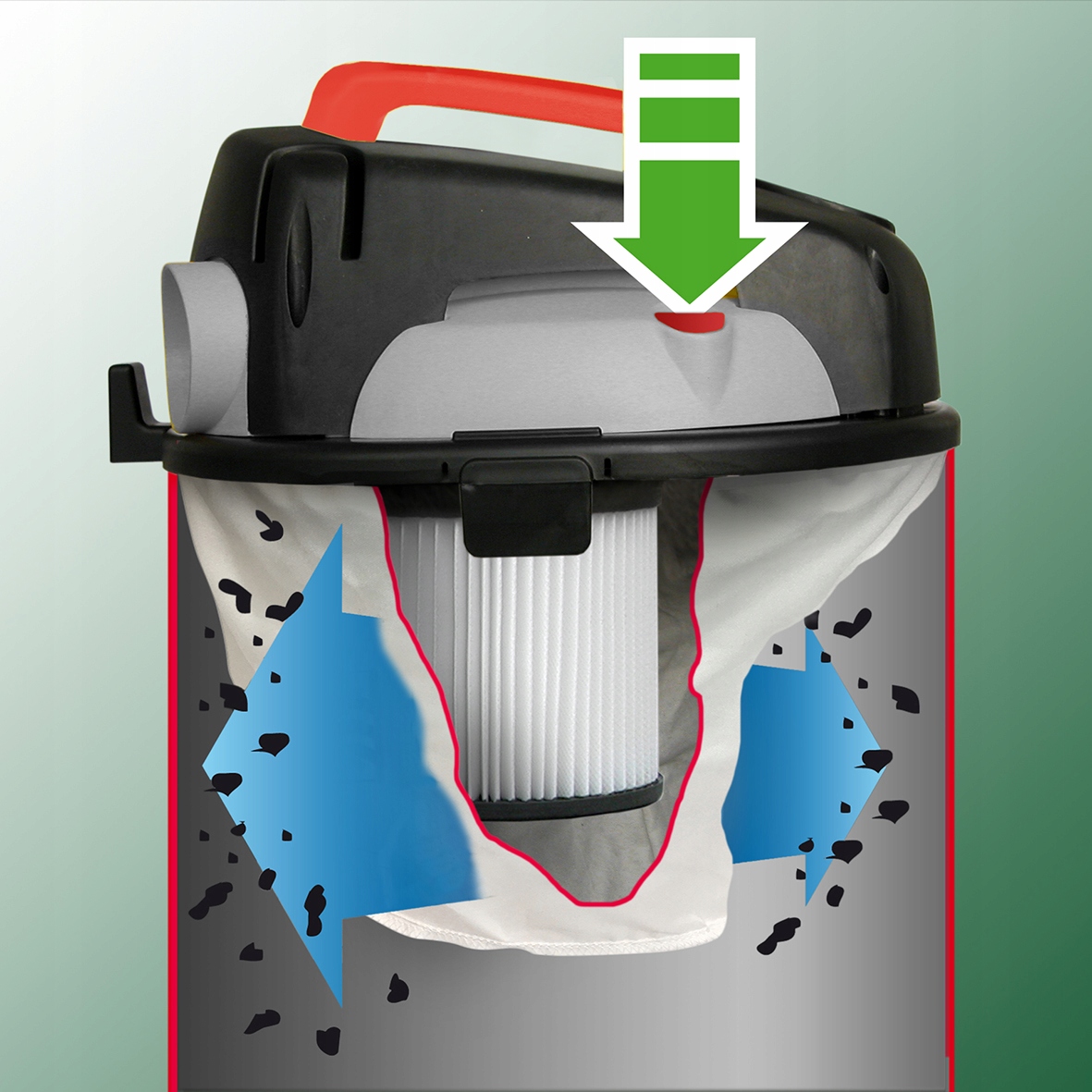 Filtr ten zakładamy na koszyk pływaka w odkurzaczu. Dzięki temu filtrowi zabezpieczamy turbinę przed dostaniem się piany jak również brudu który unosi się w zbiorniku podczas utworzonego cyklonu. Filtr ten stosujemy praktycznie zawsze. Chroni on urządzenie przed osiadaniem pyłu na turbinie. Opadający pył przy pracy bez filtru może uszkodzić turbinę.