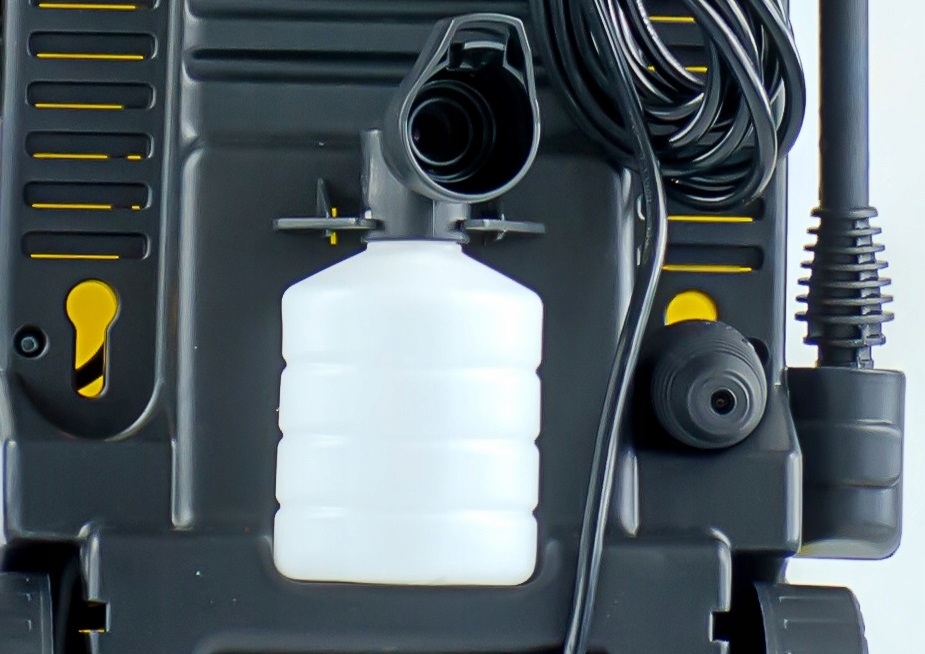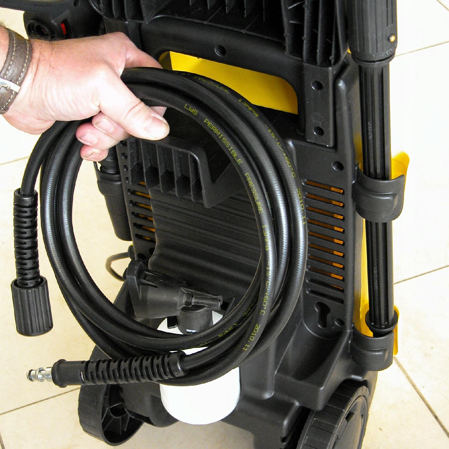 Tył obudowy urządzenia został wyposażony w uchwyt na którym można zawiesić wąż ciśnieniowy oraz wąż zasilający.