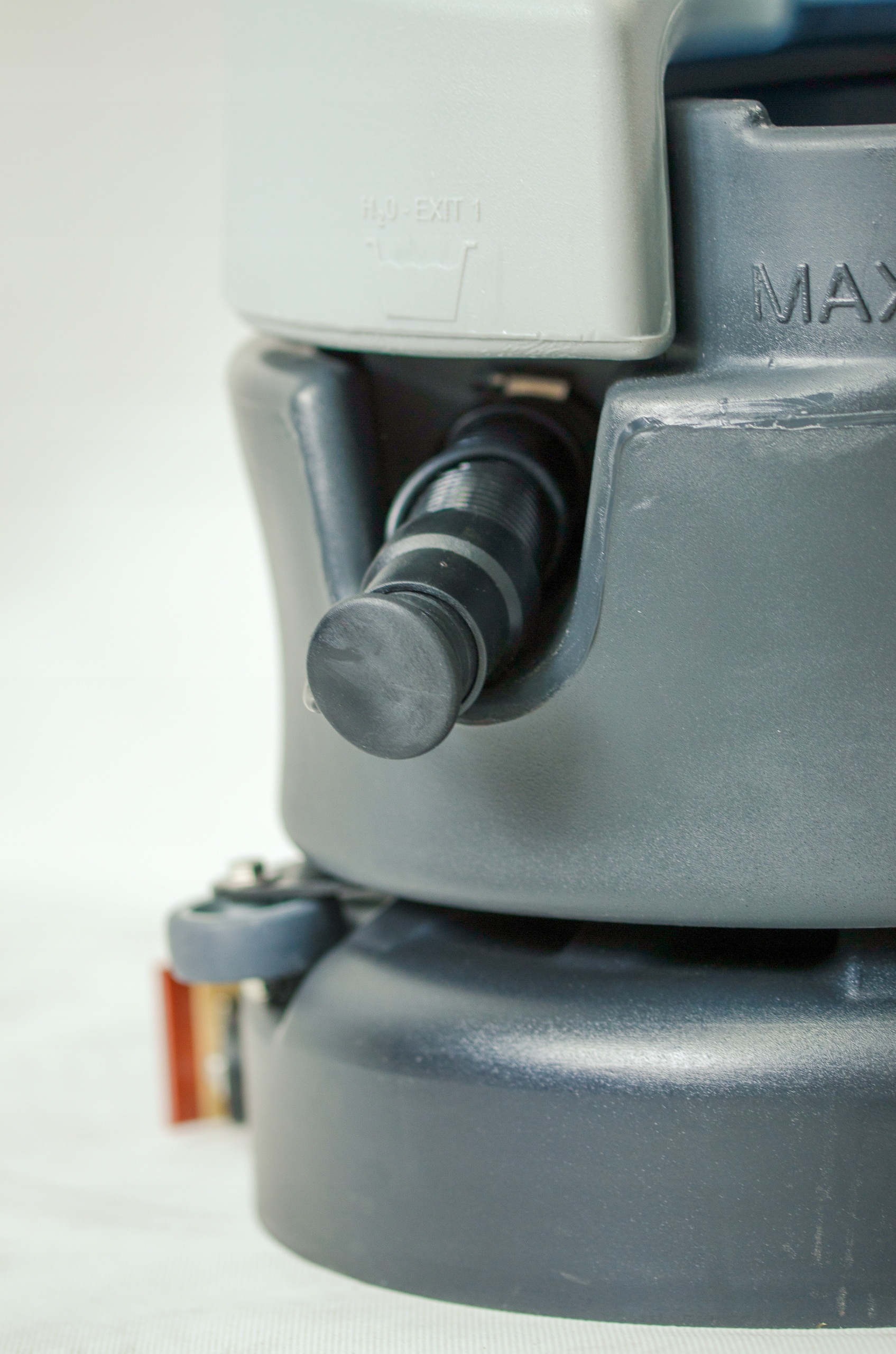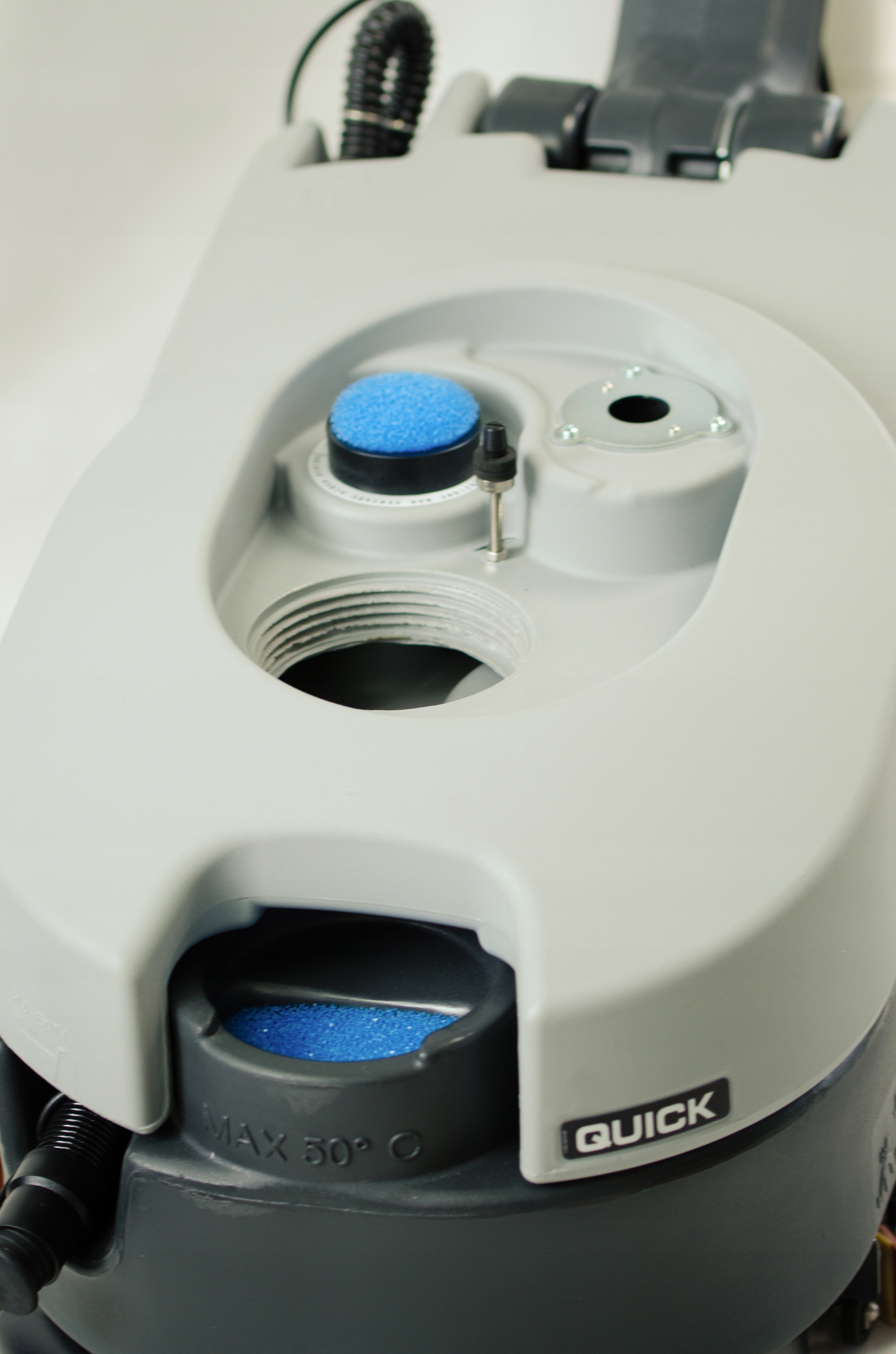 Wystarczy podnieść żółtą pokrywę, aby napełnić zbiornik wodą z płynem. Wąż spustowy do wody brudnej. Wygodne opróżnianie brudnej wody.